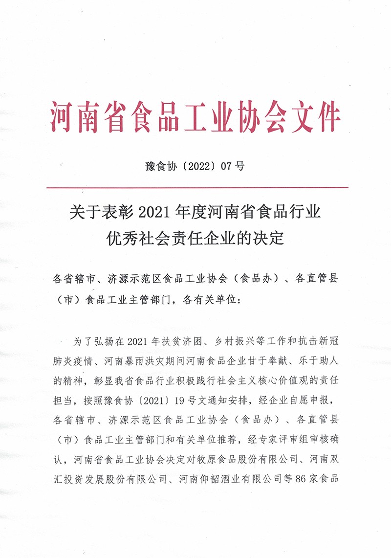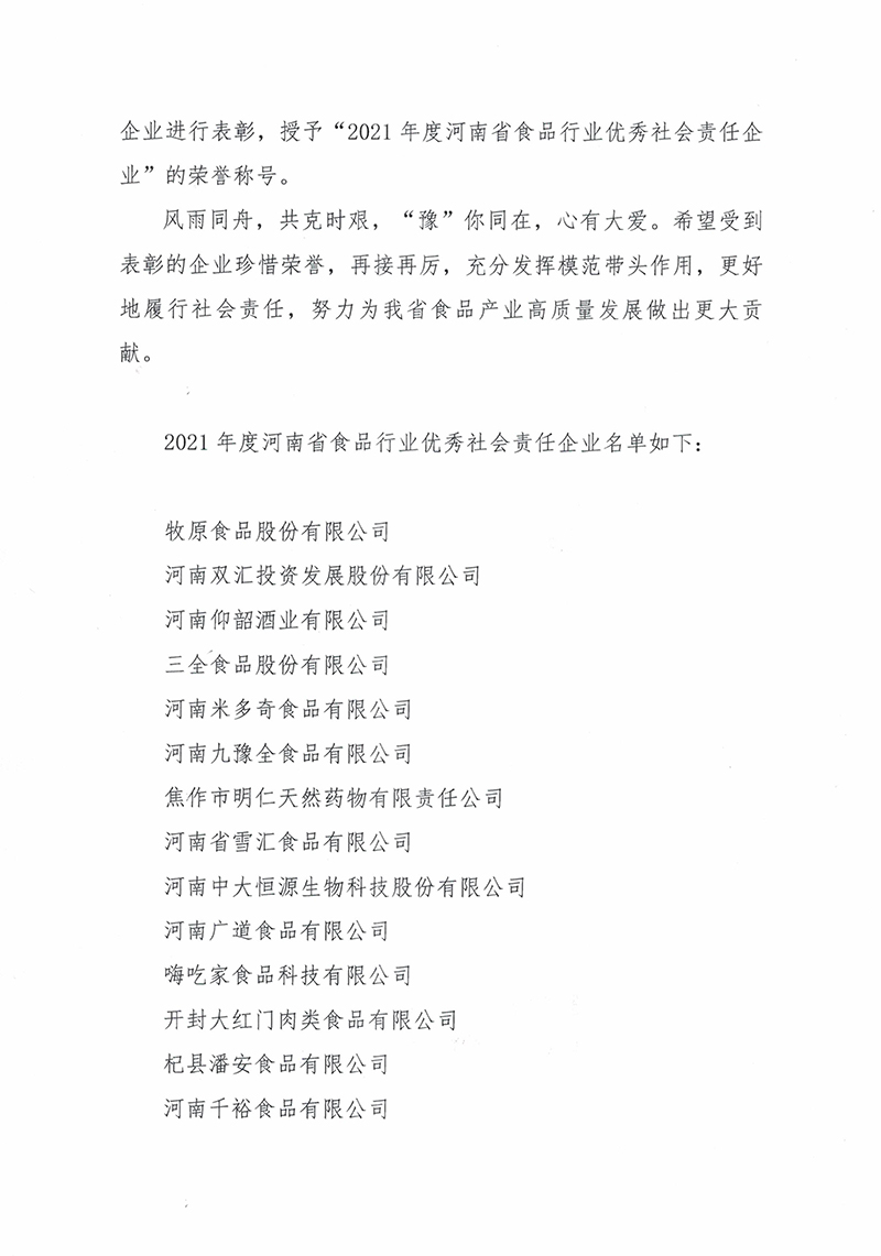首页 >> 通知公告 >>豫食协 >> 2021年度河南省食品行业优秀社会责任企业